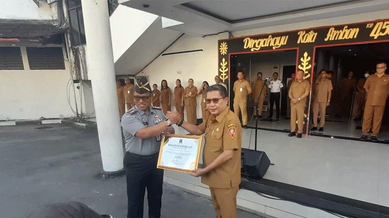 Piagam penghargaan diserahkan Kepala Kanwil Kementerian Hukum Provinsi Maluku, Saiful Sahri kepada Wali Kota, Bodewin M. Wattimena, saat apel pagi ASN Pemkot Ambon, Senin (13/10/2025) di Balai Kota.